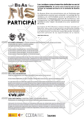 The sessions are part of RUS Buenos Aires. RUS is an international project by Basurama carried out an approach to the different cities that have been developed (Miami, Mexico City, Santo Domingo and Buenos Aires) and developed in the future (Montevideo, Cordoba, Asuncion, Lima , Santiago de Chile and San Juan de Puerto Rico), based on the specifics of your trash. Waste as socially and culturally defining elements. In the case of Buenos Aires we plan around a phenomenon that we consider essential to understand the reality of waste and social conflict in Latin America: informal collection and waste separation and its protagonists (The cardboard).